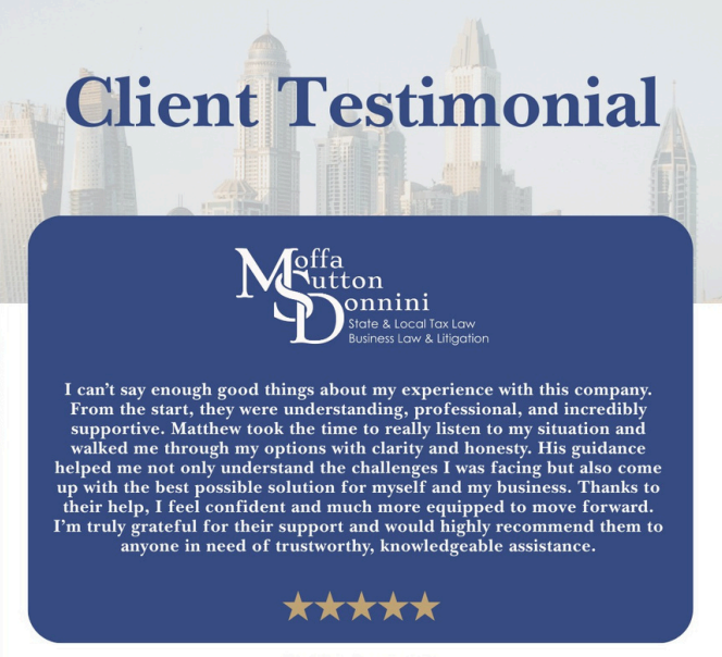At Moffa, Sutton, & Donnini, P.A., we’ve handled over 1,000 criminal sales tax investigations and know how to navigate these matters strategically from the first contact forward. If you’ve been contacted or you’re behind and worried about what’s next, contact us now for a free initial consultation.