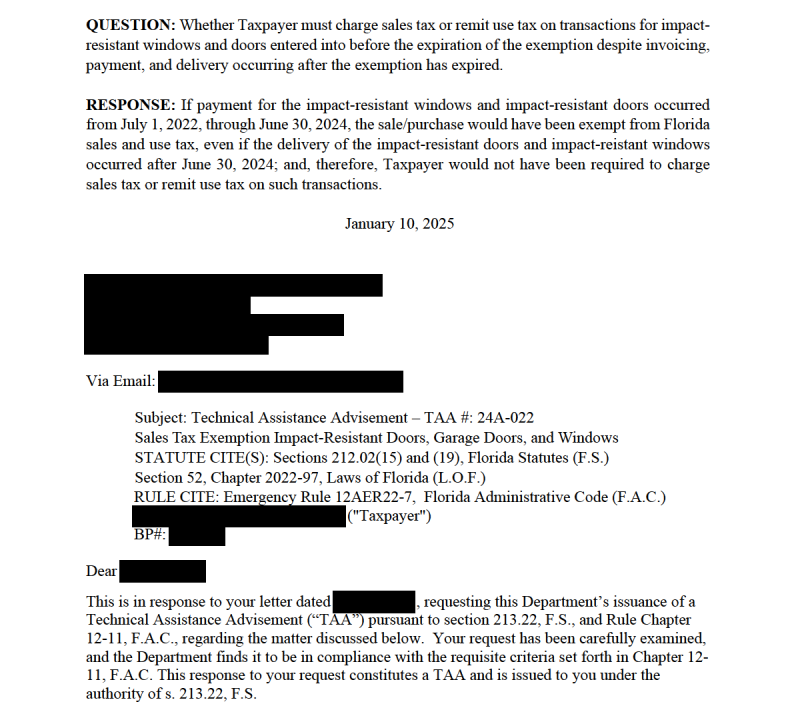 Concerning Taxpayer’s purchases of impact-resistant windows and doors pursuant to a real property improvement contract, Taxpayer must have placed the order to its vendor on or before June 30, 2024. To qualify as being exempt, Taxpayer may not have requested any delay. Regardless of when invoicing, payment, and shipment occur, the sale of the impact-resistant windows and doors to Taxpayer for real property improvement contracts will be exempt from sales and use tax.